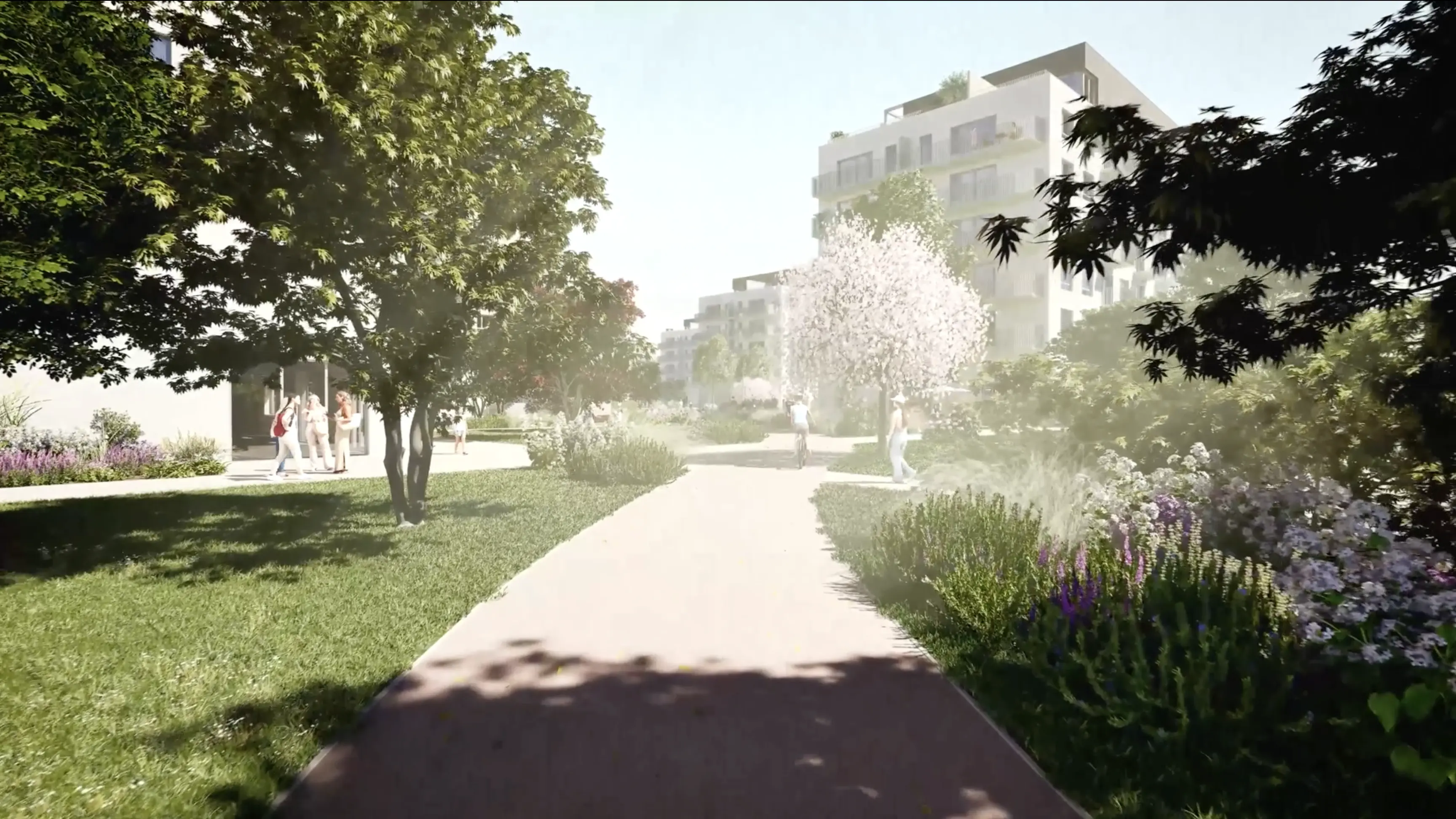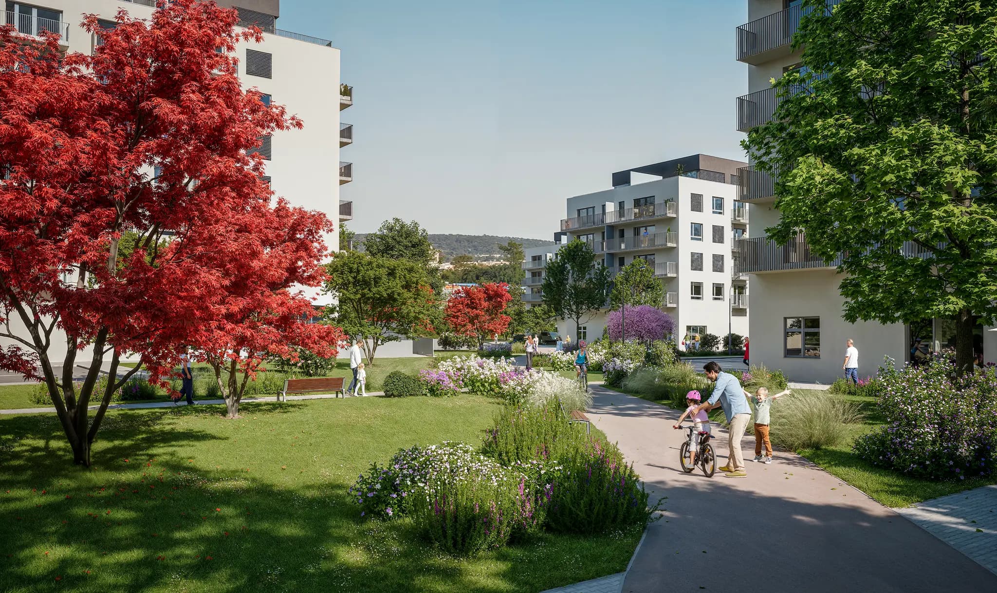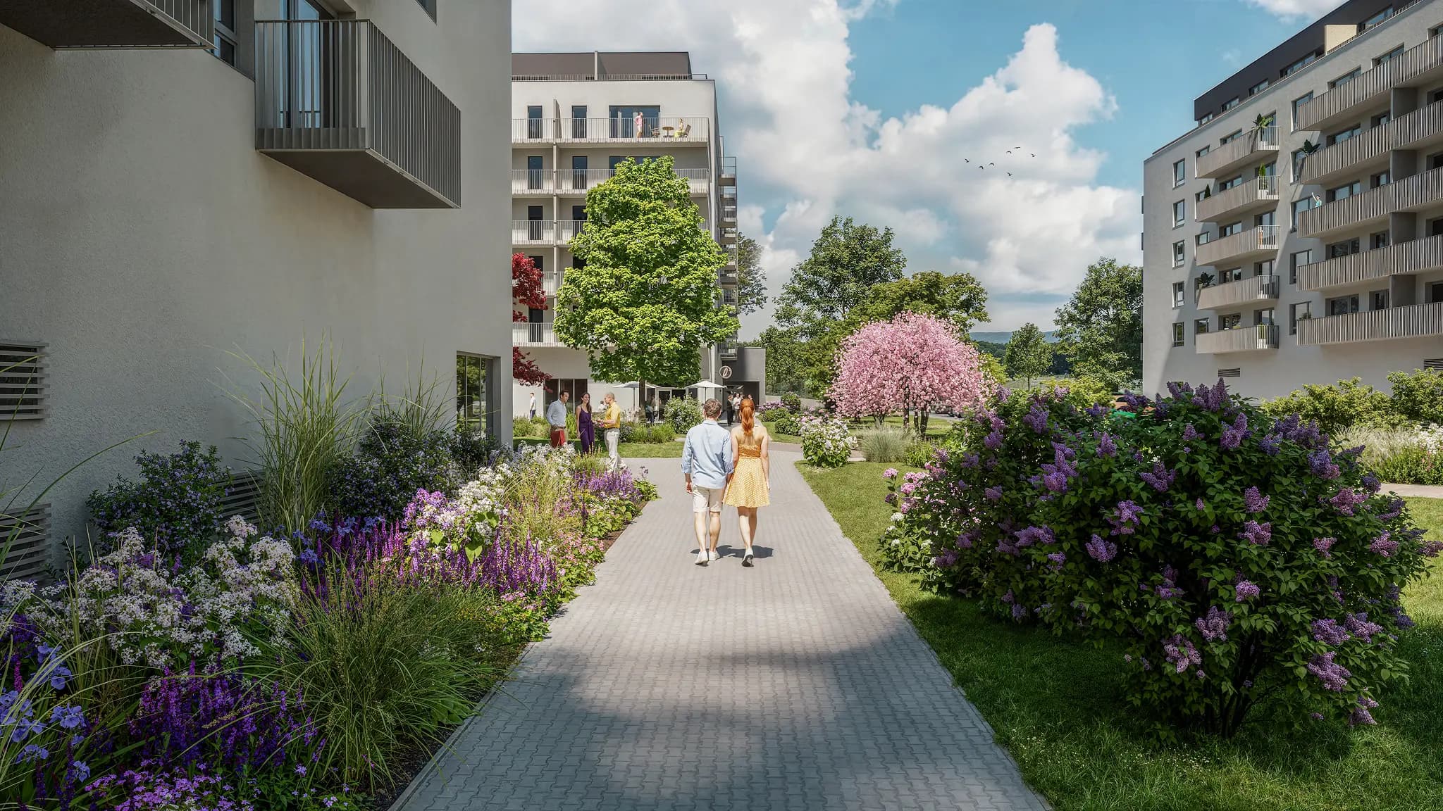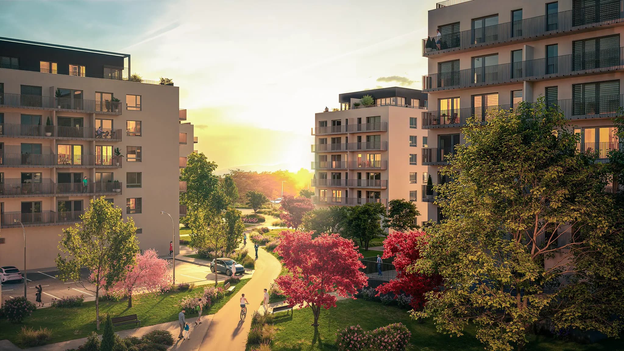 Bývanie pripravené na budúcnosť. Fotovoltické panely na strechách znižujú náklady, zatiaľ čo zelené strechy a množstvo okolitej zelene aktívne ochladzujú klímu vo vašom okolí.